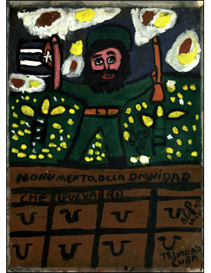Abel Pérez Mainegra, known as "Abelito," identifies himself as a "pintor primitivo." "Primitive," politically incorrect in our own vocabularies, is replaced with "autodidactic" or, even worse, in my thinking "outsider." Outside of what? Outside academic artistic practice certainly, and for that reason, often free of standards that may not always be liberating. The real appeal of the work is its vitality. It is exuberant, first the animation of its surfaces. Abelito fills every space with dots or hot colors, words or flags. The blood spattered deck of a ship fuses with cannon balls against the sea in a battle between pirates and Spaniards. It is distinct from modernism in its persistent emphasis on the figure and story telling. Abelito is a history painter. He records and celebrates the whole bloody chronicle of Cuba's epochs of slavery, wars, exploitation, revolution, and player in world events. He memorializes the heroes of the Cuban Wars of Independence, with Antonio Maceo most prominent, his hair bristling and his moustache curling to echo a grimace. He depicts the massacres of the indigenous peoples. He records current events up to the minute. There is even commentary on the Elian incident and the US presidential election. Abelito paints in the house, one front bedroom stacked with works. A nephew is also a painter and another a musician. Abelito remains close to home but the work travels. It has been shown in five foreign countries. He has had more than 45 exhibitions since 1991. |
