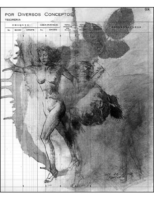 Some of Ponjuán drawings featured in Gallery 106 seem to be conceived as projects for a kind of combinatory object. An image with horns emerging from it, books that are chained, pierced, tortured. In reality, all of these drawings have a closeness to the plan, to the idea in process, and play with the appearance of the unfinished sketches. That tone is achieved with the minimal selection of the medium: pencil, graphite, and watercolors, and the use of lined paper that give this collection of drawings a seal of immediateness in spite of the meticulous technique and the attention to details. These works make us think of the artistic image as a product that is potentially measurable. It also invites us to reflect upon the difficulties inherent to any attempt to equate the artistic with the mechanical and with the rigidity of preconceived structures. The drawn images, some aggressive and some almost sweet, emerge from the graph paper like an affirmation, perhaps too romantic, of the ability of art to overcome limits and restrictions. These drawings have other implications as well. Some can be appreciated as parodies of commercial art and of the most stereotypical illustrations. The female figures, as well as the anatomical fragments that appear in many of the works, have been taken from the work of Andrew Loomis, a North American commercial artist whose books, originally published in the forties and fifties, were reprinted in Cuba during the seventies. The most popular of these books, titled "Drawing of Success" ("Dibujo de Exito"), offers quick recipes for drawing any kind of thing. It pays special attention to the human figure, represented in poses that go, according to LoomisÍ aesthetic ideals, from the pedantic to the slightly erotic. Ponjuan explores the possibilities of these "prefabricated" images. He puts them in new contexts, and exalts with irony the ridiculous aspect of the representations and the sometimes pompous, sometimes prim and proper, sense of the illustrations that are promoted as safe recipes for artists in search of success. |